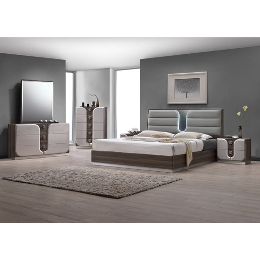 ChintalyThis modern, 67" x 88" queen-sized bed, features a gray faux-leather upholstered headboard, a 2-tone, zebra wood and silver line frame and LED ligh...