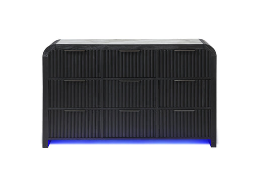 The Beckett Dresser features a black finish, white faux marble top, and drawer fronts with elegant, fluted detailing for a sophisticated, textural ...