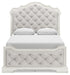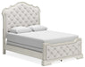Add a touch of romance to your home with this upholstered bed. The antiqued painted finish and serpentine-shaped silhouette details are the picture of easy elegance. Indulge your love of luxury with decadent button-tufted cushioning from head to toe.