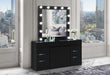 Elevate your beauty routine with the Ella Black Vanity Set by Global Furniture, a perfect blend of luxury, innovation, and modern design. Finished in a sleek black, this stunning vanity features a built-in LED bulb mirror for bright, clear lighting'ideal for flawless makeup application or daily grooming. The glass top is accented with soft LED lighting, adding a stylish glow to your space, while a built-in speaker brings entertainment and connectivity to your routine. Included with the set is a matching stool with built-in storage drawers, offering a comfortable seat and extra room for beauty essentials or accessories. Sleek, functional, and packed with modern features, the Ella Black Vanity Set turns any bedroom or dressing area into a chic, organized personal retreat.