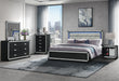Transform your bedroom into a glamorous sanctuary with the Soleil Bedroom Collection by Global Furniture USA. Finished in a rich dark charcoal, this striking group is designed to make a statement. The centerpiece is the queen bed, featuring a plush grey upholstered headboard framed with glittering silver crushed crystal trim and accented with integrated LED lighting for a soft, elegant glow. Every case piecefrom the dresser to the chestis encased in the same dazzling crushed crystal trim, including matching crystal-accented handles, creating a cohesive and luxurious aesthetic. Soleil brings together rich textures, modern design, and sparkling details, elevating your space into a high-end retreat.