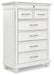 Give your retreat vintage charm with this chest. Sporting a beautifully distressed whitewash finish, it includes seven varied-sized drawers for an organized wardrobe. Generously scaled moulding from top to bottom, along with bun feet and drawer handles with a transitional aesthetic, give this chest character—evoking the feel of a quaint cottage escape.