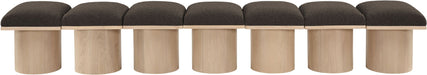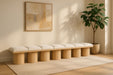 Bring valuable seating and remarkable style to your space with this Pavilion boucle fabric bench, an exquisite balance of style and usability for the entryway, bedroom, and beyond. Crafted from oak veneer with a natural finish, this bench has a 4-inch-thick seat cushion that's channel-tufted for a touch of luxury. The bench's columnar bases add a dash of art deco design, making it a captivating focal point in any room.