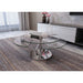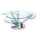 This motion cocktail table features a 32” glass top. The lower shelf separates into 3 pie-shaped three motion glass surfaces, 32" joined together and separating to stretch the table up to 46”. Motion base & floor plate are polished stainless steel.