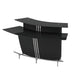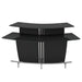This contemporary bar has a tempered black 3/8” Thick glass top and lower bar counter. 3 shelves in the rear provide bottle-height storage and two stemware racks, plus a polished stainless steel foot rail and adjustable glides on the base to level as needed. For a sleek and unique design, the wooden cabinet structure is finished in matte black and has steel accents running down vertically.