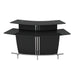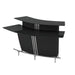 This contemporary bar has a tempered black 3/8” Thick glass top and lower bar counter. 3 shelves in the rear provide bottle-height storage and two stemware racks, plus a polished stainless steel foot rail and adjustable glides on the base to level as needed. For a sleek and unique design, the wooden cabinet structure is finished in matte black and has steel accents running down vertically.
