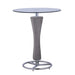 This contemporary pub table features a round, clear tempered glass top on a chrome pedestal with a cushioned pedestal upholstered in gray fabric and an open wheel chrome base.