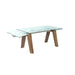 Features:- Modern extendable dining table w/ glass top & sawbuck base