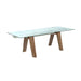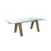 This premium contemporary dining table measures 35"x 63" with a solid 3/8" thick top and features two 16" pull-out extension leaves, allowing the table to open to a full-length of 95". The strong sawbuck design base affixed with solid wooden legs finishes the look with class.