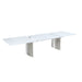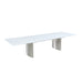 This extendable white wooden top dining table easily opened by 1 person, mounted on a brushed stainless steel double pedestal base.