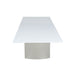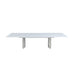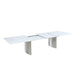 This extendable white wooden top dining table easily opened by 1 person, mounted on a brushed stainless steel double pedestal base.