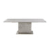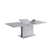 This dining table features an easy-to-use butterfly-extension mechanism, with a gray laminated wooden top & pedestal set on a brushed stainless steel floor plate, presenting a solid, neutral look that elegantly compliments your contemporary dining room.