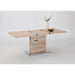 Entertain guests with this 32"x 51" rectangular, self-storing extension table with a light oak veneer and a self-storing extension that easily opens the top from 51" to 67" to accommodate additional guests. The pedestal matches the top with light oak veneer while also resembling the base with steel decorative accents running horizontally.