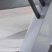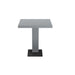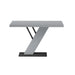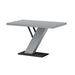 This dining table features an all-wood white gloss gray finished table top with a matching Y-shaped slanted pedestal and a matte black finished steel floorplate.