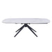 Embrace contemporary design with this artful and functional expanding ceramic dining table and matching dining chairs. A unique marbleized ceramic top opens to approximately 95”, enough to comfortably welcome the whole party around. Resting atop a pronged steel base in a matte black finish, this dining table matches the corresponding dining chairs in form and function. The chairs feature plush cushion enveloping seating, with lumbar support and a plentiful headrest, all finished in white and grey fabric and matching slender matte black steel legs.