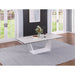 Impress your guests with this elegant contemporary dining table. Featuring a 43" x 87" extendable marbleized matte white ceramic top bonded to tempered glass with two 20" smooth pull-out extensions, this generous surface rests neatly on a daring open frame art deco solid stainless steel base in a warm matte white finish. Enjoy conversation and comfort around this unique piece.