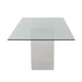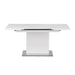 This contemporary, 32" x 47" tempered white starphire glass top table, features a pop-up extension mechanism that opens to 63" for accommodating additional guests. The top connects to a pedestal base in a white gloss finish and stainless steel floorplate.