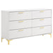 Instantly elevate the look of your bedroom oasis with this modern glam bedroom set. Chic, warm, gold elements lend a luxe accent to the upholstered platform bed and accompanying pieces. The bright, white finish sets the stage and offers a clean, contemporary aesthetic with a light and airy expression. The lovely headboard takes your breath away with its diamond tufted design and striking bar button details. Matching the warm, golden buttons are gold bracket legs, adding elevation to the bed and a retro-inspired look and feel.