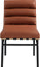 Keep guests sitting pretty for the entire meal with this Burke cognac vegan leather dining chair. This chair has rolled tufting for amazing support and durability and features an armless design that facilitates conversation between diners. A white oak veneer metal dowel on the back of the chair and under the seat lends additional interest to this modish dining chair option.