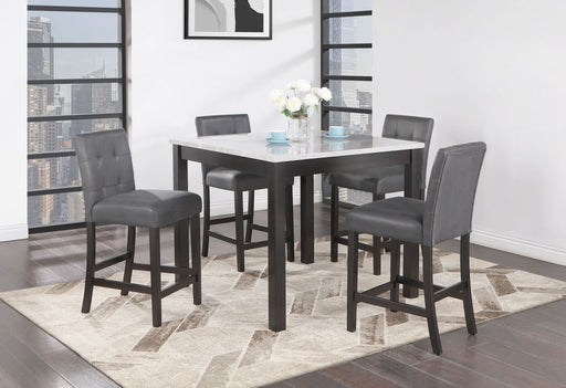 Global Furniture USAThis dining table has smooth clipped corner edges with a beautiful grey tone faux marble design. The channel back chairs add comfort and great desi...
