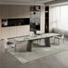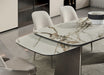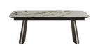 Introducing the 888 Extendable Dining Table by J&M Furniture, where cutting-edge design meets practical elegance. This contemporary dining table showcases a matte ceramic top, delivering a smooth, modern finish that is not only visually stunning but also highly resistant to scratches and heat, ensuring long-lasting durability. Perfect for hosting gatherings, the table features pull-out extensions on both sides, allowing you to effortlessly extend the table to accommodate additional guests. When not in use, the extensions tuck neatly away, maintaining a sleek profile. The painted bronze metal base provides a bold, industrial contrast, adding to the table's modern aesthetic, while the integrated ceramic accents on the base create a cohesive and sophisticated look. This combination of materials ensures both stability and a striking visual appeal, making the 888 dining table the ideal choice for those seeking versatility and refined design in their dining space.