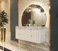 The FIJI bathroom vanity is a luxurious piece that brings elegance and warmth to any bathroom space. Its striking white finish is beautifully contrasted by radiant gold accents that fan out in a sunburst pattern across the cabinet doors, creating a captivating visual effect. Paired with matching gold vessel sinks and modern backlit mirrors, this vanity adds both style and functionality. Its sleek, vertical storage cabinet is perfect for keeping essentials organized. The FIJI is an ideal choice for those looking to add a touch of glamour to their bathroom decor.