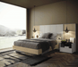Elegant bedroom with hollow tables and glass top, slatted panels and successful color combinations, provide serenity and harmony.