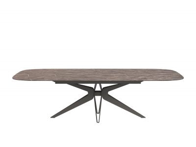 Stunning dining table adorned with a ceramic surface that perfectly emulates the elegant beauty of marble, bringing a touch of refined sophisticati...
