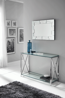 ESFConsole table in clear tempered glass top 10 mm and base glass 8 mm with polished stainless steel legs. Color: Clear Glass - Legs: Stainless Steel