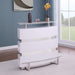 This contemporary bar sparkles with a marbleized ceramic top and timeless stainless steel accents. A light and airy high gloss wooden bar perfect for entertaining and pulling a room together no matter the event. The piece also features plentiful storage with two shelves in the back, a cabinet for bottles and stemware racks.