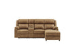 The U6980 Brown Sectional delivers the perfect balance of modern comfort and refined design, making it a standout addition to any living space. Upholstered in a rich brown camelcolored printed microfiber, this sectional offers a warm, inviting look with a soft, luxurious feel that elevates everyday lounging. Designed for both relaxation and functionality, the sectional features a loveseat with a built-in console and one reclining seat, ideal for effortless comfort and convenience. The matching chaise also reclines, allowing you to fully stretch out and unwind, while integrated storage within the chaise keeps blankets, pillows, or essentials neatly tucked away. With its thoughtful layout and sophisticated finish, the U6980 sectional transforms your living room into a stylish retreat built for comfort and versatility.