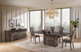 The focal point of the collection is the stunning dining table, which expands from 59" to 71" with the easy-to-use leaf extension. The table and buffet are finished in a rim surfaced oak high gloss lacquer, providing a beautiful and durable surface that will withstand the test of time. The beige quilted eco-leather inlay adds a touch of elegance and texture, creating a warm and inviting atmosphere.