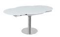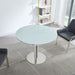 The Pub Dining Table is a modern take on intimate dining. The Pub Table allows for a minimal overall footprint in the home, while also providing ample space for everyday use. The white frosted glass top is accentuated by a polished steel base, lending itself to many home designs. The Pub table prominently features two pull-out leaves, transforming itself from casual to entertaining at a moment's notice.