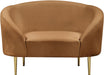 Get comfy while remaining chic in this elegant Ritz saddle velvet chair. Plush saddle-colored upholstery provides a soft texture that is pleasing to the senses, while its curved design offers a contemporary touch to your home furnishing. Gold metal legs complement the chair's sophisticated saddle color, creating a gallant piece anyone would be proud to display in their home.