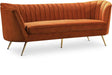 Lean back and lounge in luxurious style on this stunning Margo velvet sofa by Meridian Furniture. This contemporary sofa features plush velvet upholstery that is both classy and sumptuous against your skin, a single seat cushion and rounded arms that curve into a low, rounded back, creating a perfect, modern piece for your home. stainless steel legs support this sofa and provide stunning contrast to the sofa's plush, fabric.