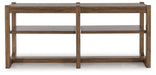 This sofa table sits comfortably at the intersection of modern lodge and farmhouse aesthetics. Your warm and welcoming disposition is reflected in the charming architectural elements and light brown glazed finish. Even with its poise, this table remains practical. With its multifunctional design, it doubles as a stunning TV stand or as a bookcase in the office.