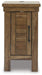 This chairside end table might appear simple at first sight. But a closer look reveals beauty in the details. With a plank-effect cabinet door, a tobacco brown finish and antiqued bronze-tone hardware, it’s simply beaming with charm. This side table's cabinet and tabletop space, along with USB charging, will serve you well for years to come.
