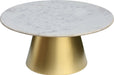 Entertain friends in sophisticated style around this Sorrento table. The round shape ensures everyone can see and hear each other in conversation. The genuine marble top helps prevent damage from cups, dishes or other items being pushed or placed on the table. The cone-shaped brushed gold base gives the top a sturdy foundation while the illustrious color wows guests who see it. The base is large enough to ensure cups at the edge can't fall off. Place this beautiful table in your favorite space with chairs around it and enjoy good company.