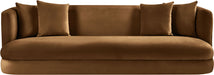 The Alder saddle velvet upholstered sofa is an invitation to relax. Its rounded silhouette and soft velvet upholstery create a cozy and inviting space, perfect for lounging or hosting guests. Whether you're unwinding after a long day or entertaining, this sofa adds warmth and timeless style to your living room.