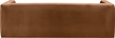 Spice up your living room or den with this Henson velvet sofa. This handsome chair has a boxy design that suits any contemporary room with ease. It's covered in rich saddle velvet that's luxuriously soft to the touch and against the body, making it everyone's favorite seat. The solid wood frame of this modern sofa adds durability, resilience, and long-lasting enjoyment to this sofa, making it look right at home in your up-to-the-minute space.