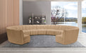 Create a seating group that works for every possible situation with this Infinity 11-piece sectional and other pieces in the Infinity collection. Upholstered in soft Camel velvet material that feels great against the skin and offers long-wearing beauty, this piece fits with other Infinity items for an infinite number of combinations that get your seating requirements just right but that look just as nice when used on their own.