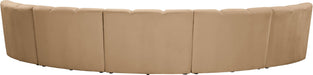 Create a seating group that works for every possible situation with this Infinity modular 5-piece sectional and other pieces in the Infinity collection. Upholstered in soft Camel velvet material that feels great against the skin and offers long-wearing beauty, this piece fits with other Infinity items for an infinite number of combinations that get your seating requirements just right but that look just as nice when used on their own.
