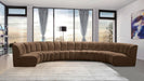 Create a seating group that works for every possible situation with this Infinity modular 7-piece sectional and other pieces in the Infinity collection. Upholstered in soft Brown velvet material that feels great against the skin and offers long-wearing beauty, this piece fits with other Infinity items for an infinite number of combinations that get your seating requirements just right but that look just as nice when used on their own.