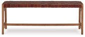 Express your sense of contemporary yet comfortable style with this accent bench. Its on-trend frame is accented by brown leather strips in a basket weave pattern for a mid-century modern aesthetic. Tuck this modern gem into an entryway or home office.