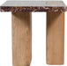 A bold fusion of rich materials, the Ravenna burgundy genuine marble top and natural oak wood base end table showcases burgundy red cherry-colored marble with striking veining. Its handcrafted marble surface is beautifully balanced by a natural oak wood base, blending warmth with architectural form. Rooted in Art Deco influence, this statement piece is designed to elevate any space with sculptural elegance.