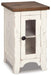 Double take. Sporting a two-tone finish that pairs a distressed vintage white with aged natural pine color, this chairside end table elevates the art of rustic farmhouse living. Enhancing its charm: shelved storage visible through the cabinet door with inset metal grill.