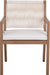 Make your outdoor oasis even more inviting with this Maui Outdoor Patio Dining Arm Chair. Crafted with an aluminum frame to look like teak without the maintenance requirements, this dining arm chair offers both style and convenience. Its resilient fabric cushions are water-resistant and plump and have quick-dry foam inserts. With its contemporary resort look, this chair adds sophistication to any patio, porch, or deck setting. Embrace the essence of outdoor comfort and style with this elegant addition-your perfect companion for leisurely moments outdoors.