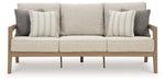 This sofa is a beautiful addition to any outdoor living space. Effortless in its simplicity, this piece echoes your easygoing sensibilities. Combining durable, cutting-edge engineered materials, its Weatherwood construction enhances the contemporary design. Rest assured, the thick cushions and accent pillows are wrapped in high-performance fabric that’s fade-resistant, stain-resistant and a breeze to clean. Pair with the matching loveseat and swivel lounge chair for a spectacular seating arrangement.