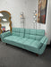 Sofa bed upholstered in a rich turquoise blue woven fabric.