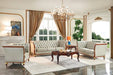 High-End Living Room Set in light grey leather color with brown wood and gold accent. This set will be nice addition to any home. Available with coffee table and side tables. HL, Leather col. P4 Grey , wood color: brown